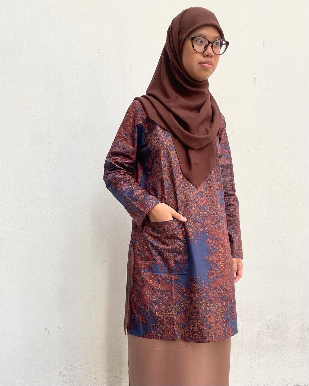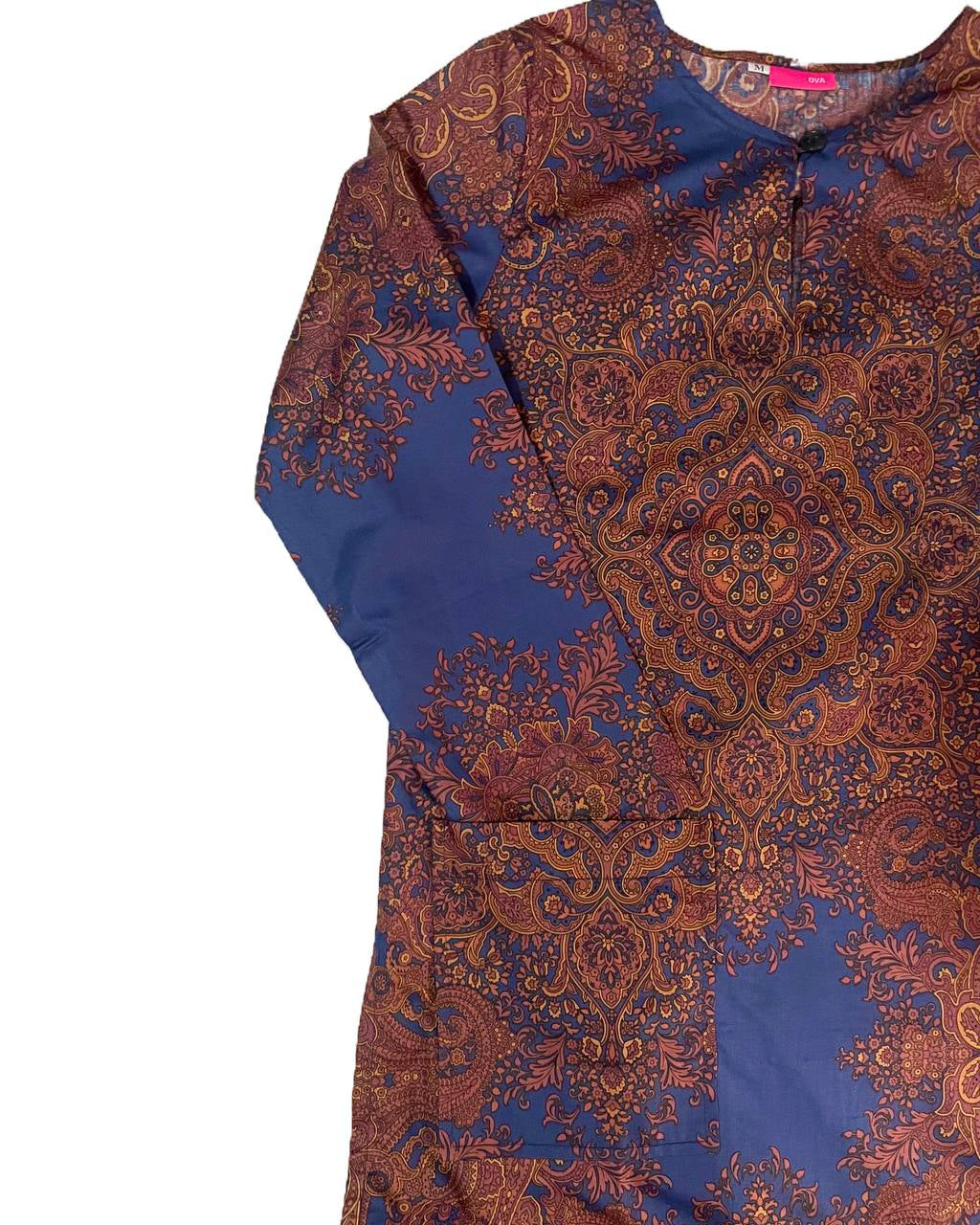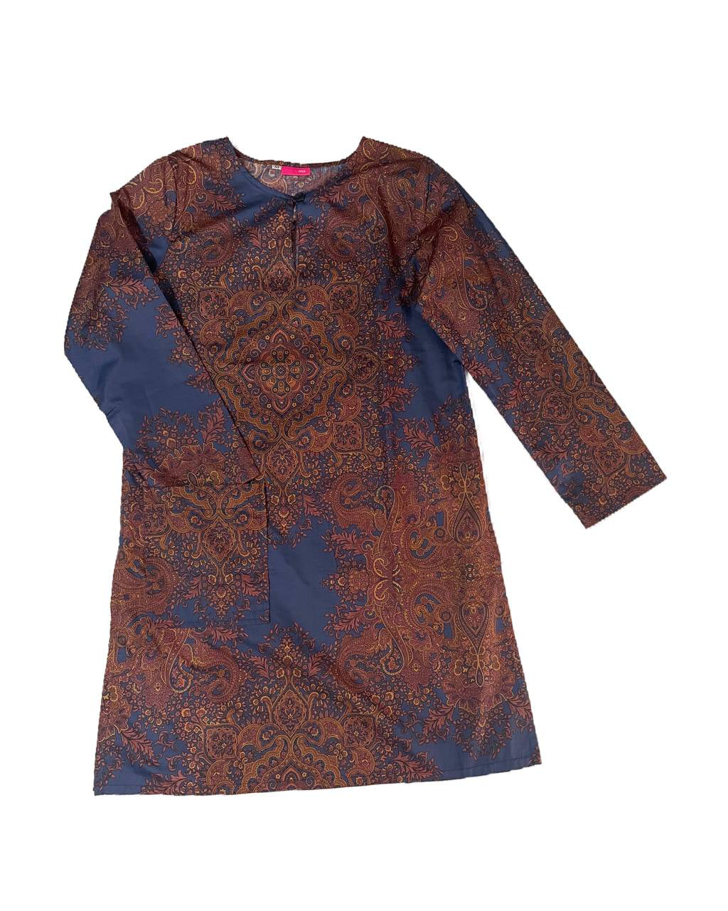 Cotton Long Blouse in Badoque Print. Round neckline with a button, a pocket at front right, side slits and back darts. Position of Motifs differs for every blouse.