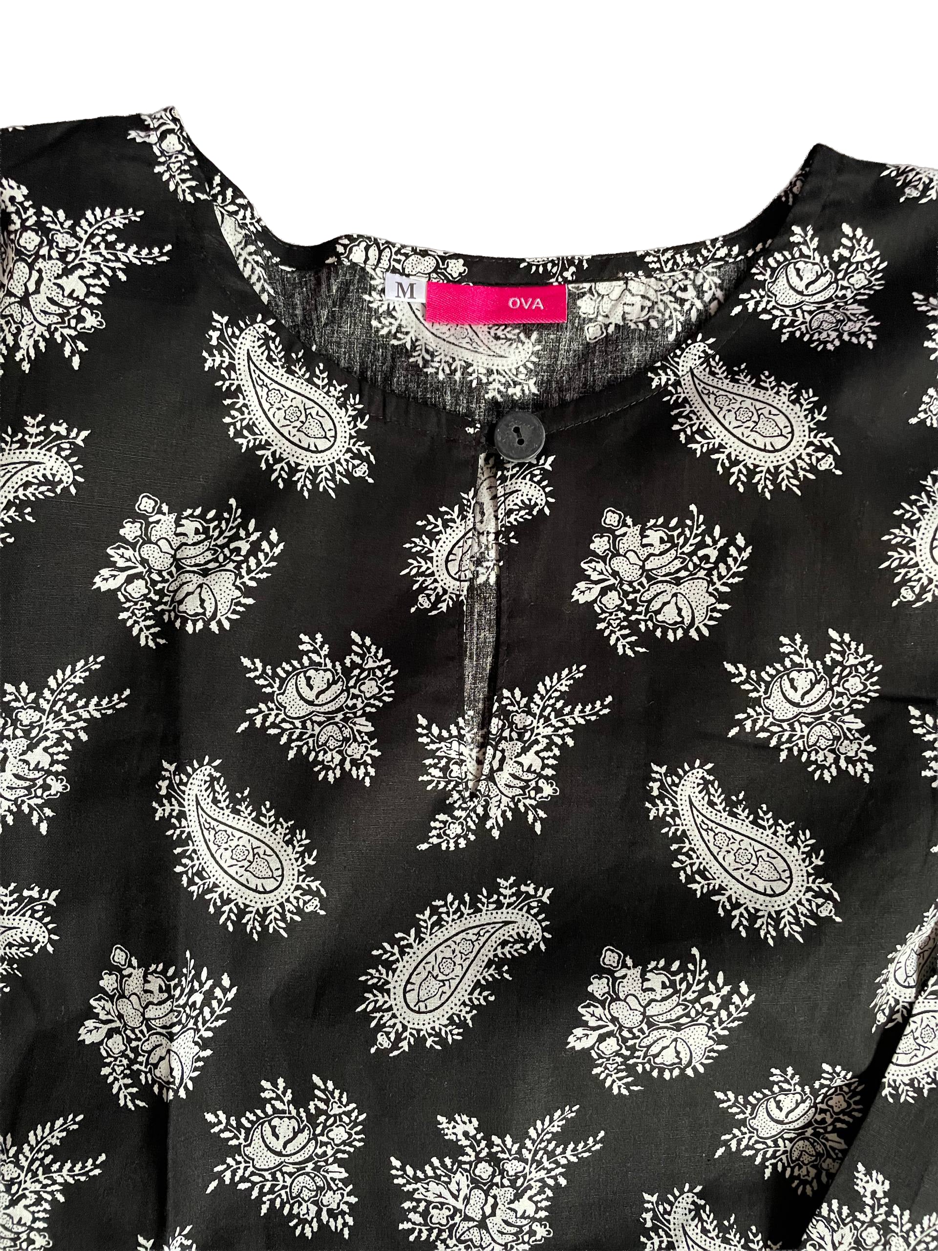 Long Blouse in Soft Cotton. Round neckline with a button, a pocket at front right and back darts. In Paisley Floral Black and White.