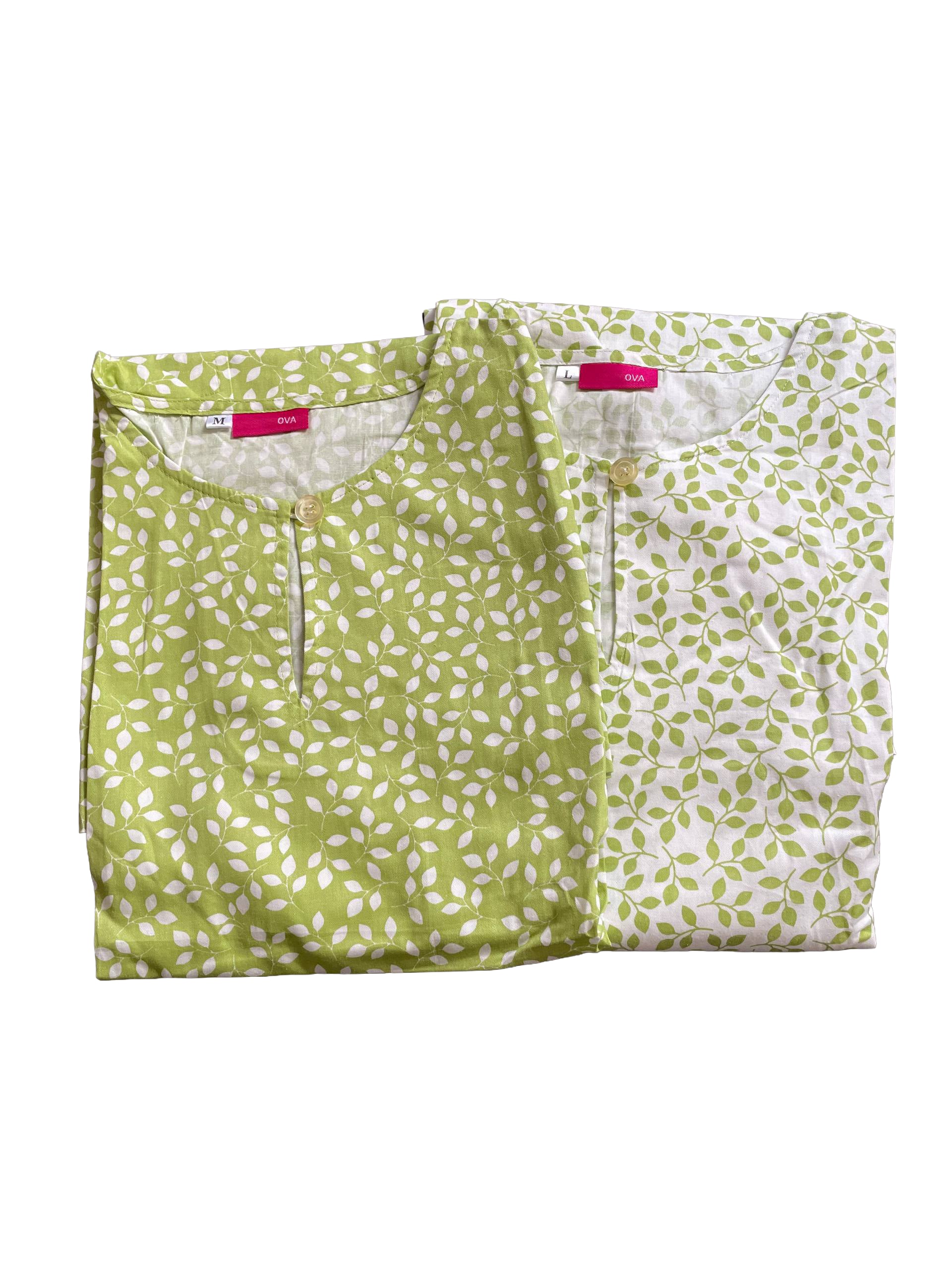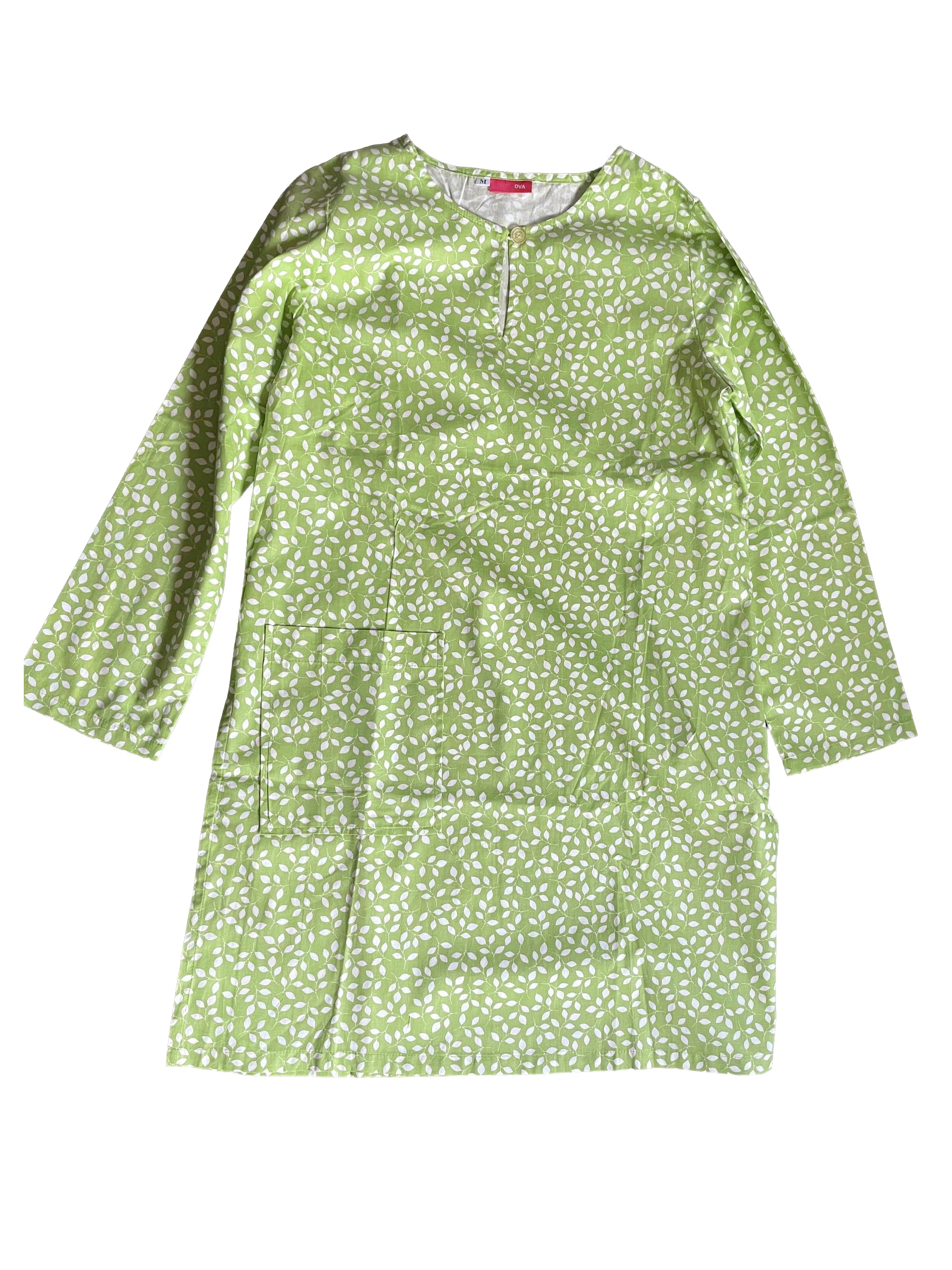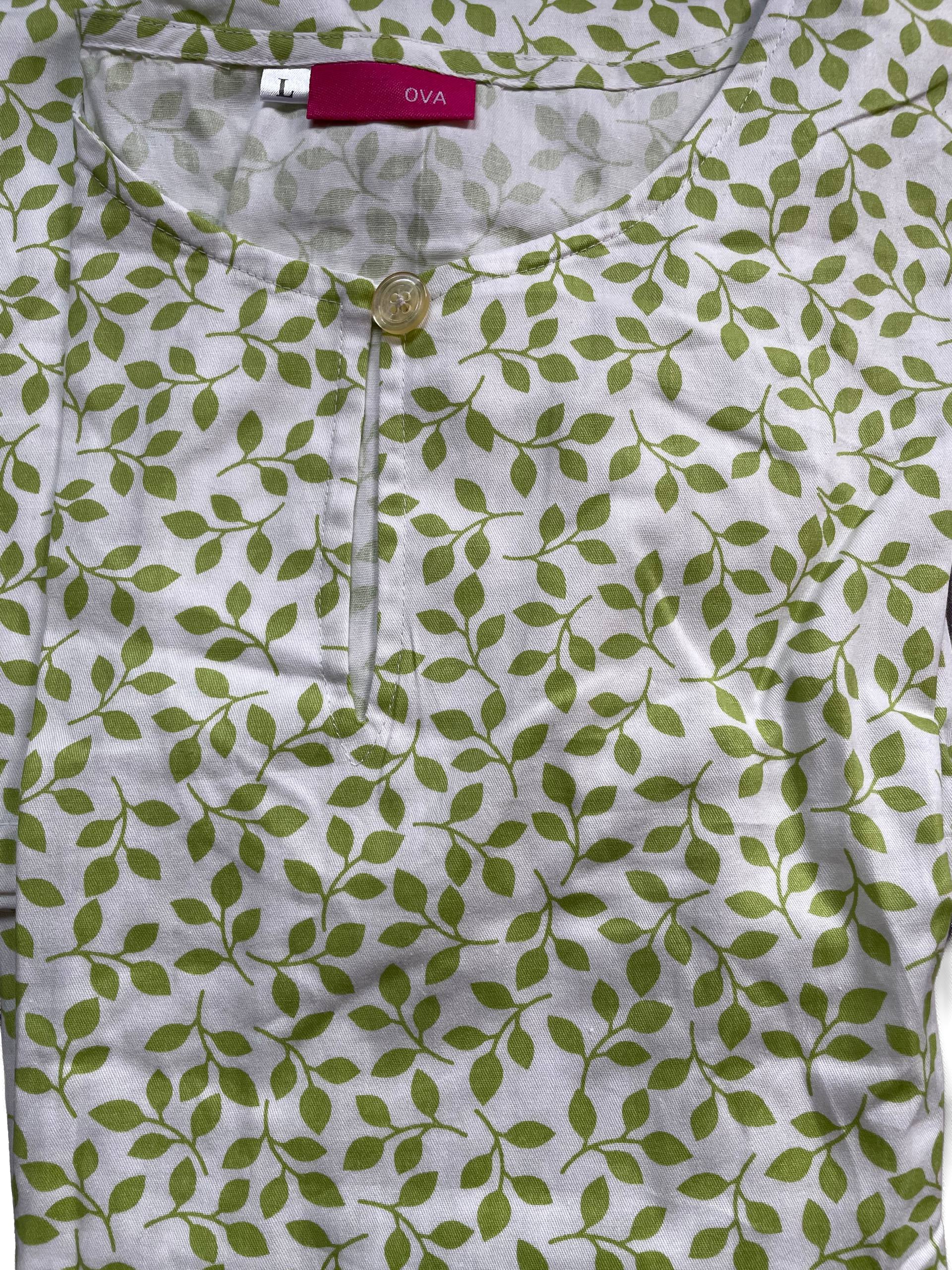 Long Blouse in Soft Cotton. Round neckline with a button, a pocket at front right and back darts. In 2 colours, green leaves with white background and white leaves with green background.