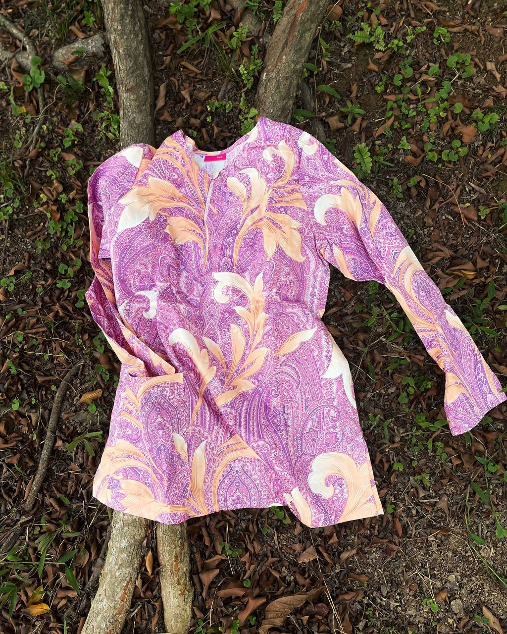 Blouse with round neckline and a button, a pocket at front right, slit slits and back darts. In Cotton with a satin shiny sheen which is suitable for everyday elegance and formal events. In rich plum hue with peach and ivory florals. Position of motifs are different from every blouse.