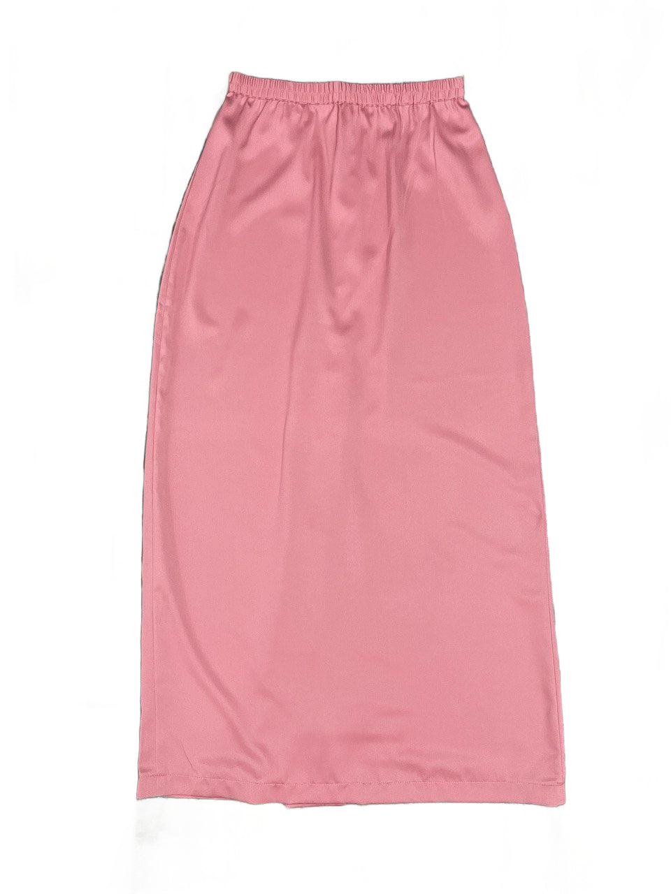 - Skirt Slim Cut in Matt Satin Dusty Pink with pleats at back. Elastic waist band at front and back. Invisible zip at back.