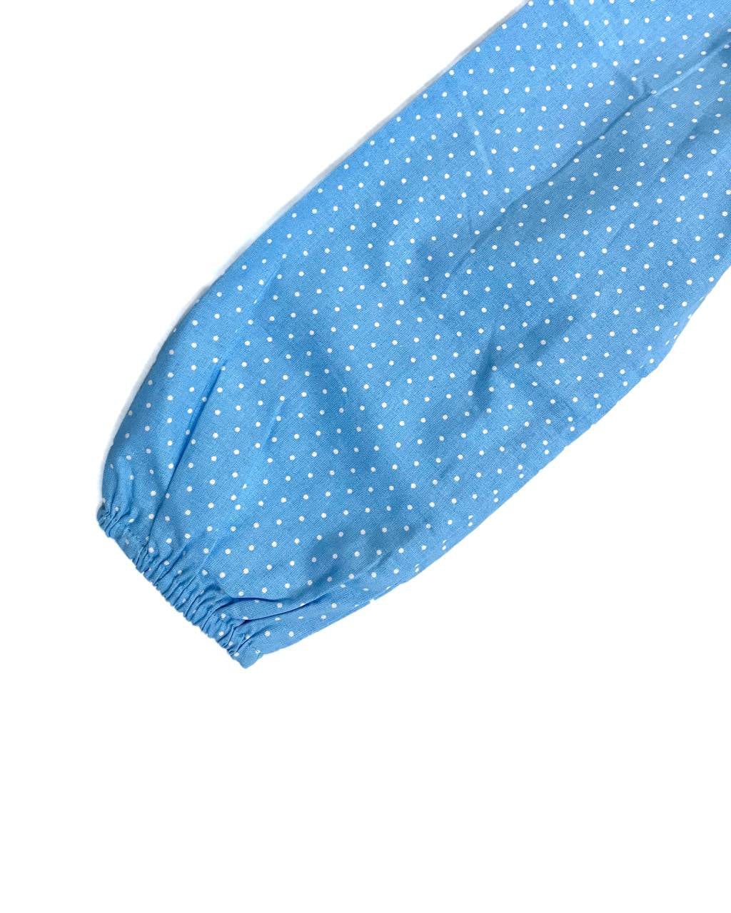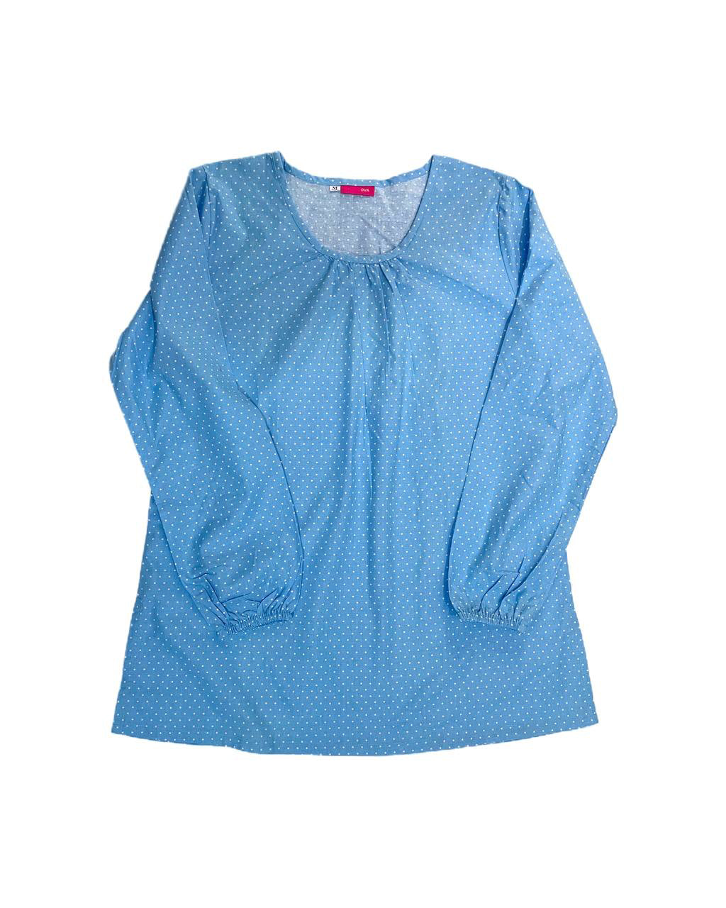 Loose-Cut Blouse in cotton mixed with linen polka dots in baby blue and black. With gathers at round neckline and elastic cuffs.